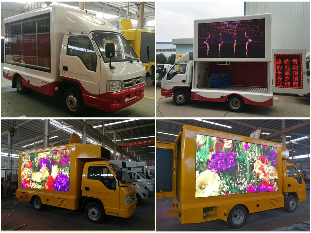 廣告車選裝配置:客戶可根據需求選裝屏幕清晰度(P10彩屏、P8彩屏、P6彩屏、P5彩屏、P4彩屏)、單面彩屏、雙面彩屏、雙面